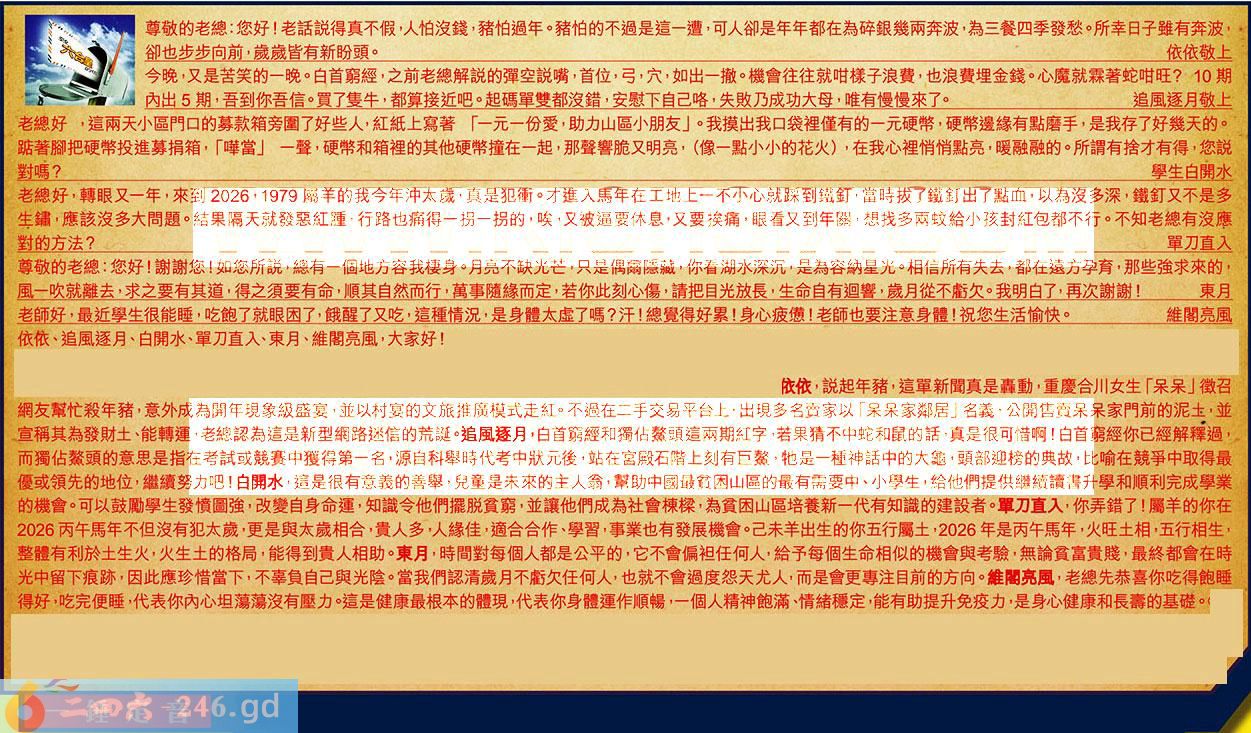 【4】.老總好,轉眼又一年,來到2026,1979屬羊的我今年沖太歳,真是犯衝。才進入馬年在工地上一不小心就踩到鐵釘,當時拔了鐵釘出了點血,以為沒多深,鐵釘又不是多生鋪,應該沒多大問題。結果隔天就發悪紅腫,行路也痛得一拐一拐的,唉,叉被逼要休息,又要挨痛,眼看又到年關,想找多兩蚊給小孩封紅包都不行。不知老總有沒應對的方法?單刀直入