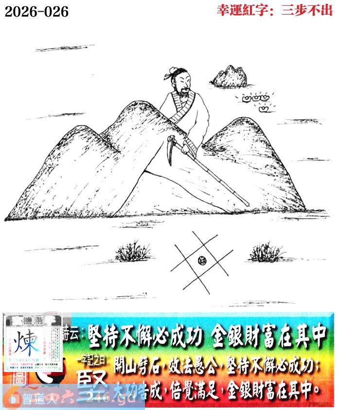 026期老版跑狗一字記之曰:【堅】 詩雲:堅持不懈必成功,金銀財富在其中。 開山劈石,效法愚公,堅持不懈必成功; 大功告成,倍覺滿足,金銀財富在其中。 玄機測字:《煉》