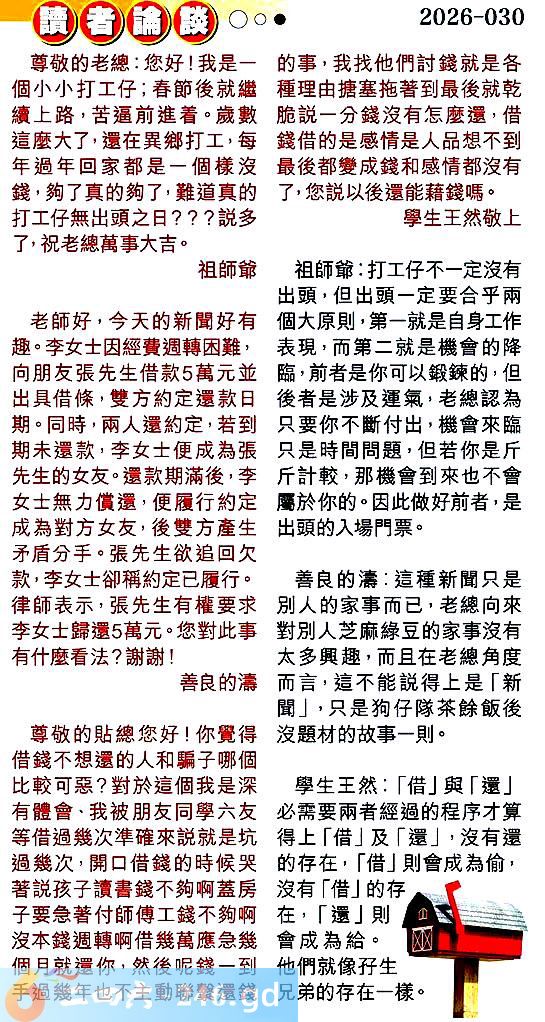 第030期讀者論談 1.尊敬的老總:您好!我是一個小小打工仔;春節後就繼續上路,苦逼前進着。歲數這麼大了,還在鄉打工,每年過年回家都是一個樣沒錢,夠了真的夠了,難道真的打工仔無出頭之日???說多了,祝老總萬事大吉。祖師爺 〖祖師爺〗:打工仔不一定沒有出頭,但出頭一定要合乎兩個大原則,第一就是自身工作表現,而第二就是機會的降臨,前者是你可以鍛練的,但後者是涉及運氣,老總認為只要你不斷付出,機會來臨只是時間問題,但若你是哲罘斤計較,那機會到來也不出頭的入場門票。 2.老師好,今天的新聞好有趣。李女士因經費遇轉困難,向朋友張先生借款5萬元並出具借條,雙方約定還款日期。同時,兩人還約定,若到期未還款,李女士便成為張先生的女友。還款期滿後,李女士無力償還,便履行約定成為對方女友,後雙方產生矛盾分手。張先生欲追回欠款,李女士卻稱約定已履行。律師表示,張先生有權要求李女士歸還5萬元。您對此事有什麼看法?謝謝!善良的濤 〖善良的濤〗:這種新聞只是別人的家事而已,老總向來對別人芝麻綠豆的家事沒有太多興趣,而且在老總角度而言,這不能說得上是「新聞」,只是狗仔隊茶餘飯後沒題材的故事一則。 3.尊敬的貼總您好!你覺得借錢不想還的人和騙子哪個比較可惡?對於這個我是深有體會、我被朋友同六友等借過次準確來说就是坑過幾次,開口借錢的時候哭著説孩子讀書錢不夠啊蓋房子要急著付師傅工錢不夠啊沒本錢遇轉啊借萬應急幾個月就還你,然後呢錢一到手過幾年也不主動聯繫還錢的事,我找他們討就是各理由搪塞拖著到最後就乾脆说一分錢沒有怎麼還,借錢借的是感情是人品想不到最後都變成錢和感情都沒有了,您說以後還能藉錢嗎。學生王然敬上 〖學生王然〗:「借」與「還」必需要兩者經過的程序才算得上「借」及「還」,沒有還的存在,「借」則會成為偷,沒有「借」的存在,「還」則會成為給。他們就像生兄弟的存在一樣。