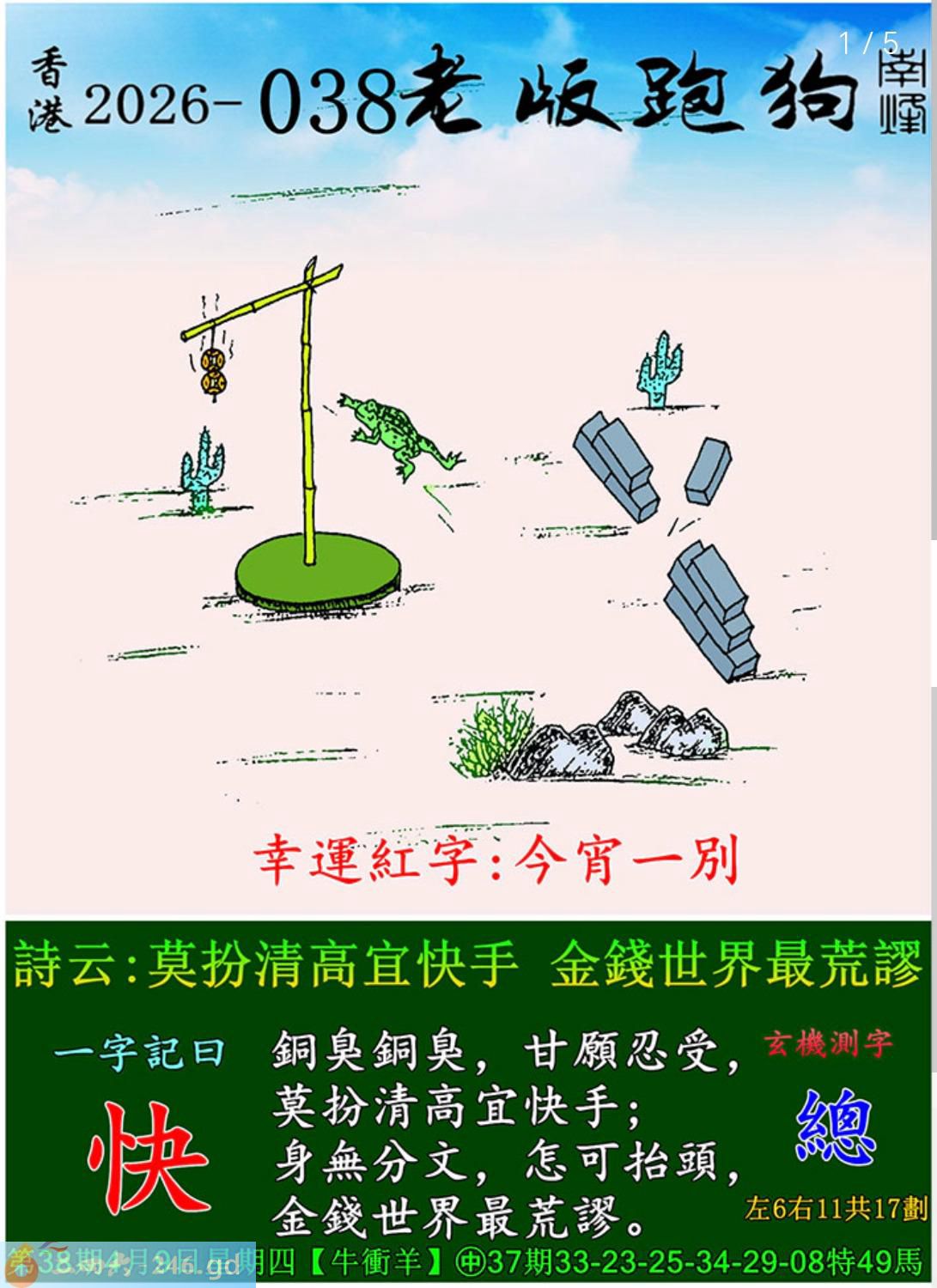 本帖最后由潮汕蔡于2026-4-919:39编辑 038期老版跑狗一字記之曰:【快】 詩雲:莫扮清高宜快手,金錢世界最最荒謬。 銅臭銅臭,甘願忍受,莫扮清高宜快手; 身無分文,怎可抬頭,金錢世界最荒謬。 今期簡單蒙一下,僅供參考: “銅臭銅臭,甘愿忍受,莫扮清高宜快手。” “銅臭銅臭”,用了重复語句,“銅臭”是指金錢,用重复語句應該是表示今期特碼為孖碼。 圖中金錢為兩枚,挂在“7”形竹架上,279,“9”位猴,9歲狗,狗无金。 再把“2”銅錢与“7”形架分開看,“7”位屬火肖馬,“2”銅錢應該是在火位,那么孖碼合2數且与金有関的只有金肖猴一碼11,屬火行。 點題一字記之曰“快”,是指“快手”,十二生肖有“手”的只有猴。(快7手4,7411。) “身無分文,怎可抬頭,金錢世界最荒謬。” 身上連一文錢都沒有,就會抬不起頭,那么反過來説,能把頭高高抬起的必然是有錢人,六合中有錢人一般指向金肖猴,猴的頭粒碼為11。 今期主猴一碼11開特。(小防蛇02,龍27,鷄10。) 六合無絕對,慎參! 潮汕蔡 2026年4月9日。